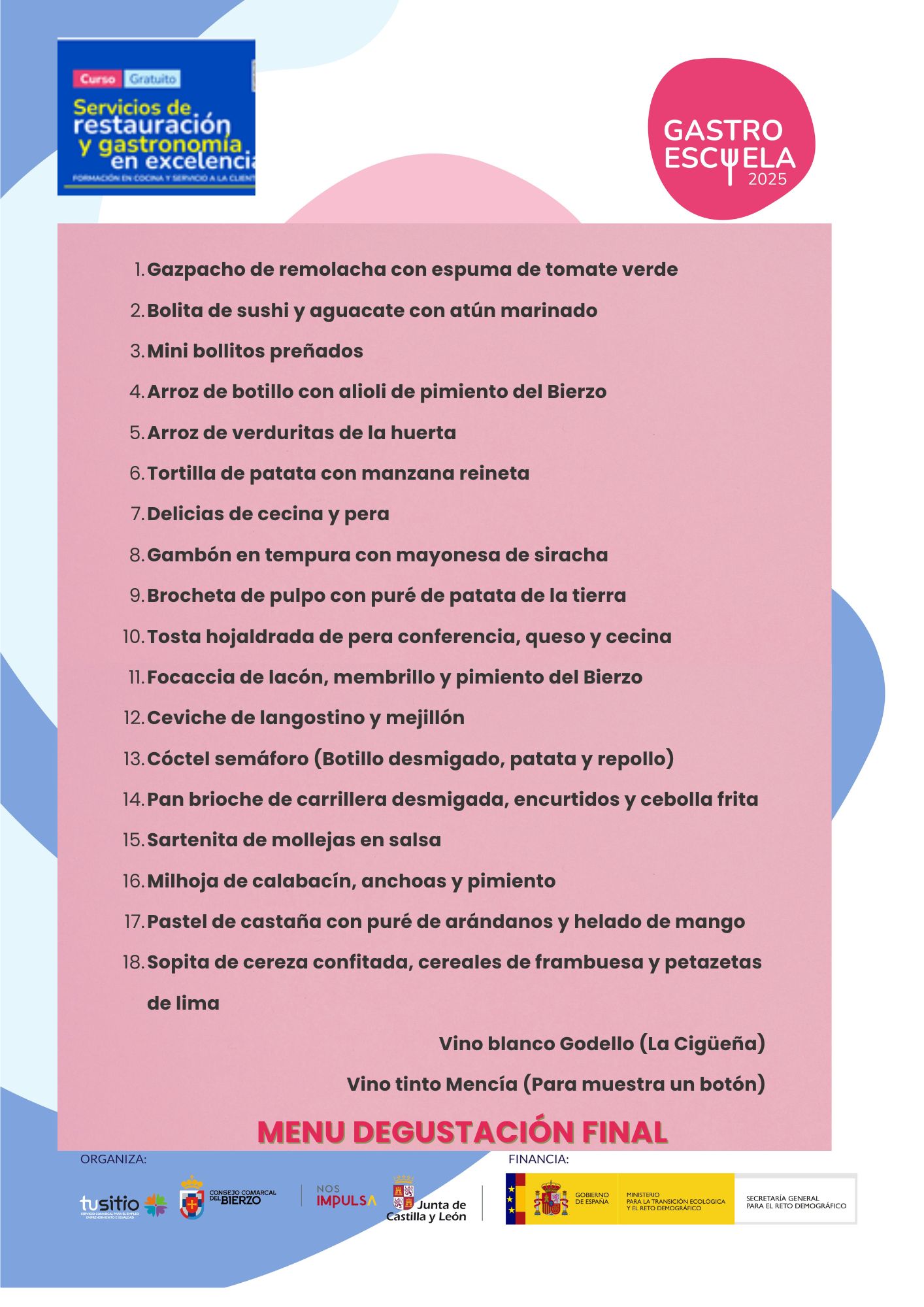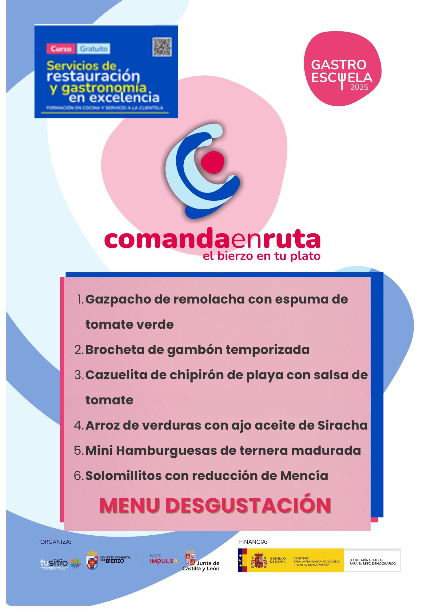 Como resultado de la actividad formativa se desarrollarán diversas actuaciones complementarias que reforzarán el aprendizaje y darán visibilidad al trabajo realizado. Entre ellas destacan la elaboración de un Recetario gastronómico, que recopilarmación proporcionará conocimientos especializados para la preparación de alimentos y bebidas, así como para la atención a la clientela, siempre en un contexto drá las creaciones del alumnado, y la puesta en marcha de un Gastroblog, un espacio digital que difundirá la experiencia formativa, los platos elaborados y las buenas prácticas aprendidas. Asimismo, se fomentará de manera especial el uso de productos bercianos, contribuyendo así a la valorización de los recursos locales, la identidad gastronómica de la comarca y el impulso de la economía de proximidad.